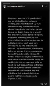 ব্রুকিলেনর অভিযোগ, তাঁর মা শেষ মুহূর্তে নিকোলার বিয়ের পোশাক বানানো বাতিল কের দেন, যে পোশাকটি পরে নিকোলা