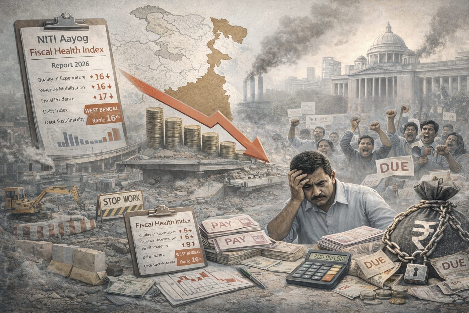 সংক্ষেপে বলা যায়, নীতি আয়োগের Fiscal Health Index-এ পশ্চিমবঙ্গের নিচের দিকে অবস্থান কেবল একটি প্রশাসনিক সূচক নয়। এটি এমন একটি সঙ্কেত, যা থেকে পরিষ্কার হয় যে রাজ্যের অর্থনীতি, রাজনীতি এবং বাজেট ব্যবস্থার মধ্যে ভারসাম‍্য কিছুতেই রক্ষা করা যাচ্ছেনা। ফলে সামাজিক ব্যয়, ঋণের বোঝা এবং সীমিত রাজস্বের মধ্যে ক্রমাগত টানাপোড়েন চলছে। এই ভারসাম্য ভবিষ্যতে কতটা টেকসই হবে, সেটাই এখন সবচেয়ে বড় দুশ্চিন্তা বিষয়।